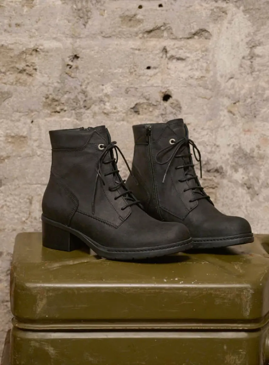 Stoer en vrouwelijk; dat is deze enkelhoge boot van gewaxt leer. De hielpartij en de stevige hak van de schoen houden je…