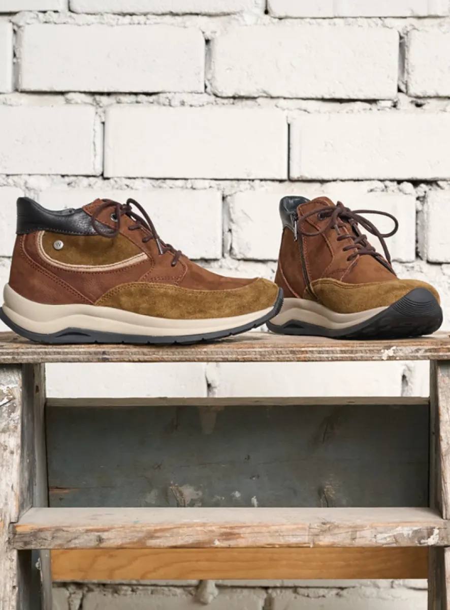 Lopen gaat bijna vanzelf met deze stoere enkelhoge veterschoen. De Scone is namelijk uitgerust met een geweldige zool: deze is dempend en heeft een oplopende neus, waardoor op een subtiele manier de afwikkeling van de voet wordt gestimuleerd. Het bovenwerk bestaat uit een combinatie van diverse leersoorten die prachtig bij elkaar passen. Dit geeft de schoen een luxe uitstraling.Pasvorm: Geschikt voor gemiddelde voeten. De Scone valt wat klein. Twijfel je tussen twee maten? Kies dan een maat groter (richtlijn breedtemaat G)De speciaal ontworpen achterkant voorkomt slippen van de hielMet polsterrand – een soort kussentje voor je hielUitneembaar anatomisch voetbed – geschikt voor eigen zooltjesGemaakt van zacht en soepel leerFlexibele zoolVolledig met leer gevoerd voor een goede vochtopnameUitgerust met veter én rits – makkelijk in- en uitstappen en optimaal verstelbaarDempende EVA-tussenzoolEffectieve hakhoogte: 1 cm (hakhoogte minus de zooldikte aan de voorzijde). Schachthoogte: 8 cm. Gebaseerd op maat 38, het aantal centimeters kan bij andere maten afwijken.